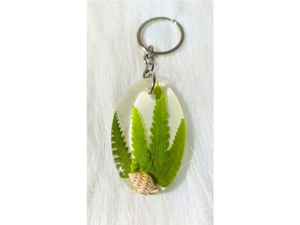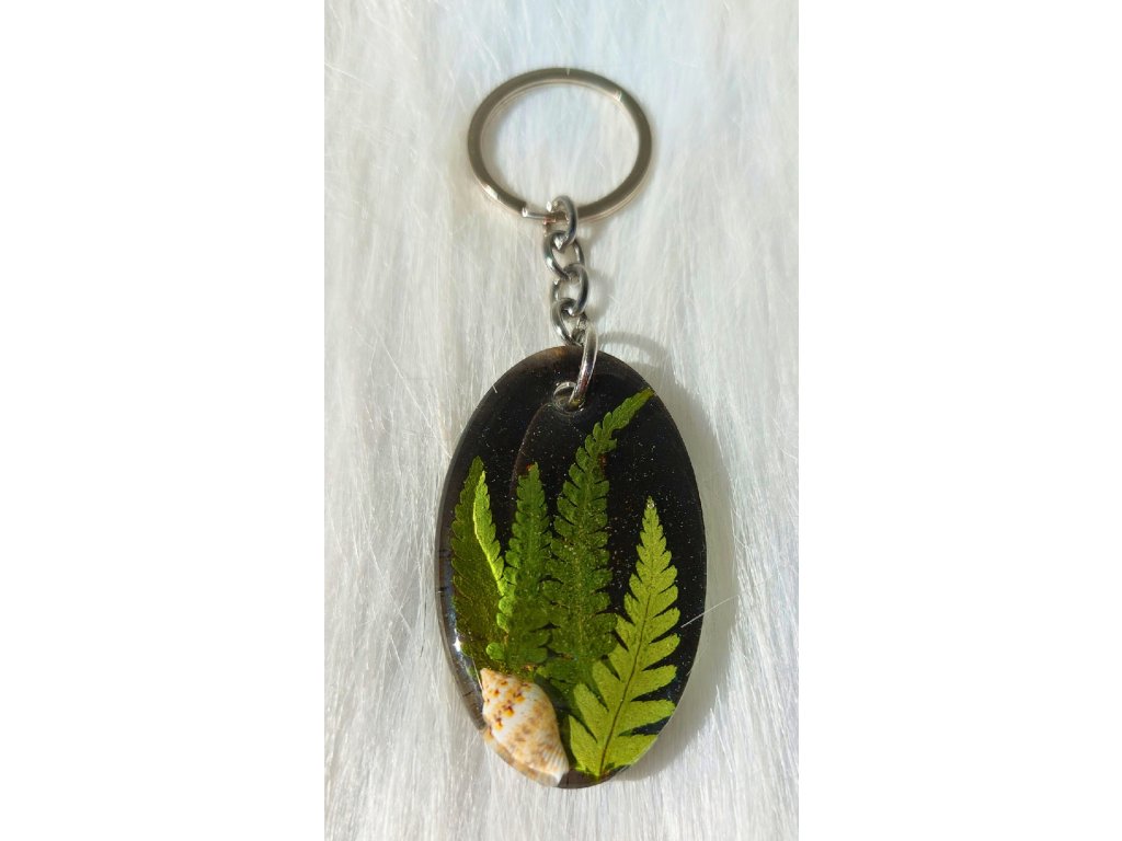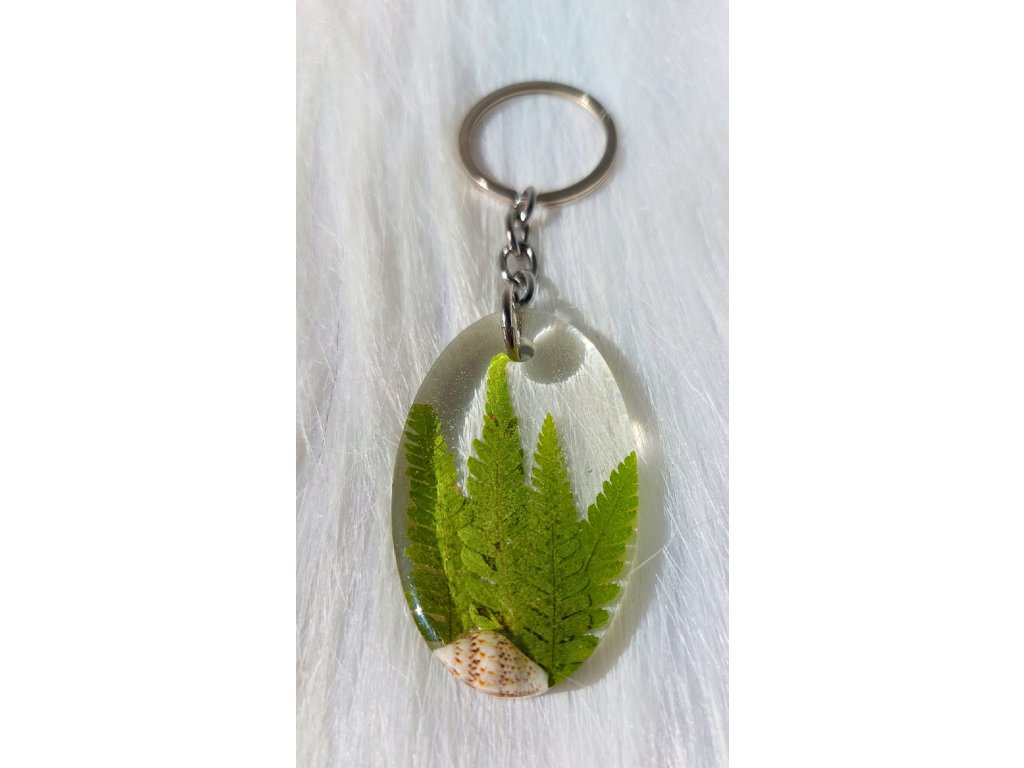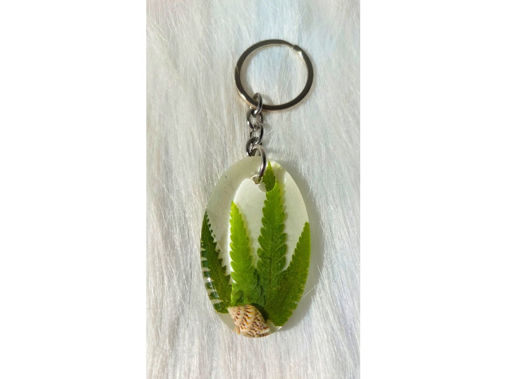 Originální ručně vyráběná klíčenka, která v sobě ukrývá ručně trhané kapradí a jemnou mušličku zalitou do křišťálově čisté pryskyřice.